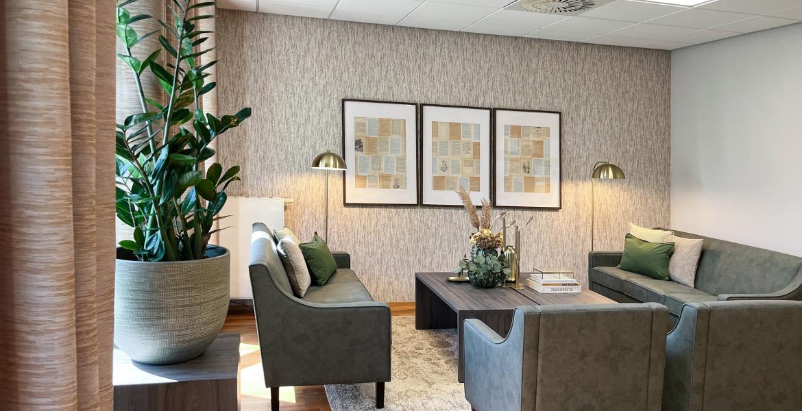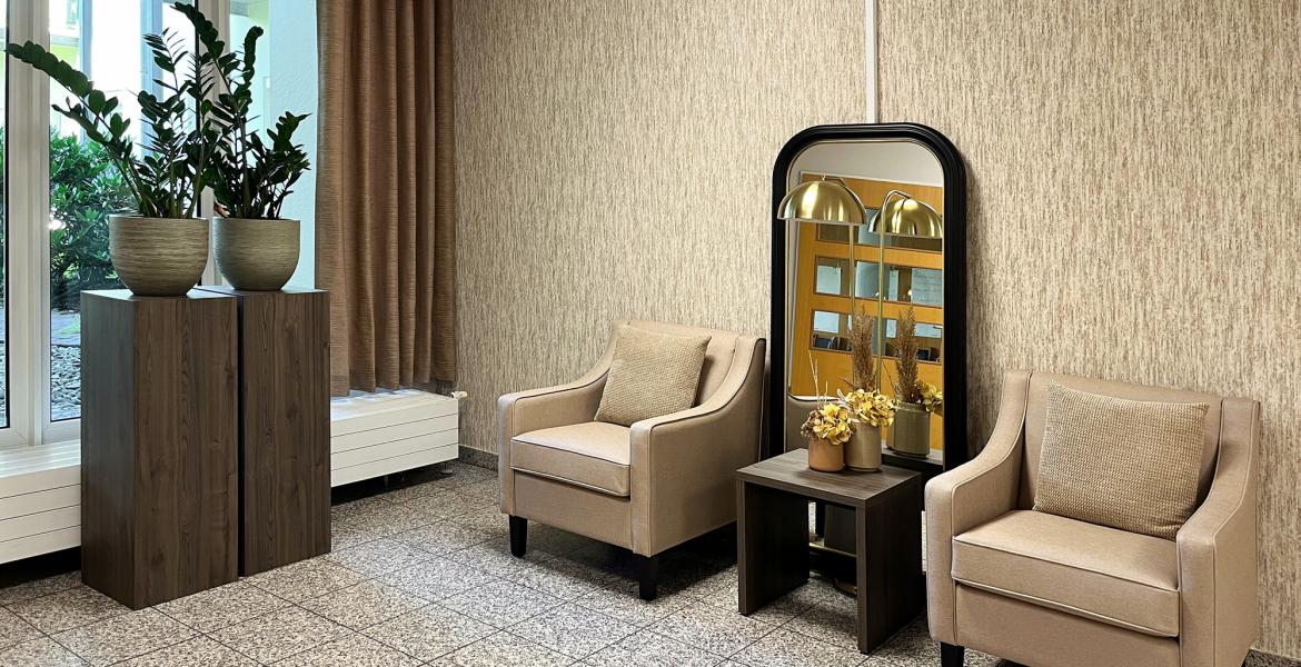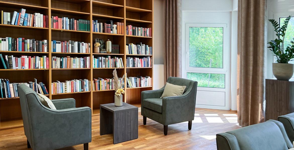 Der großzügige Eingangsbereich mit eingegliederter Cafeteria, das lichtdurchflutete Restaurant und die gemütliche Bibliothek laden die Bewohner ebenso zum Verweilen ein wie die große, wunderschöne Gartenanlage und angegliederter Terrasse.